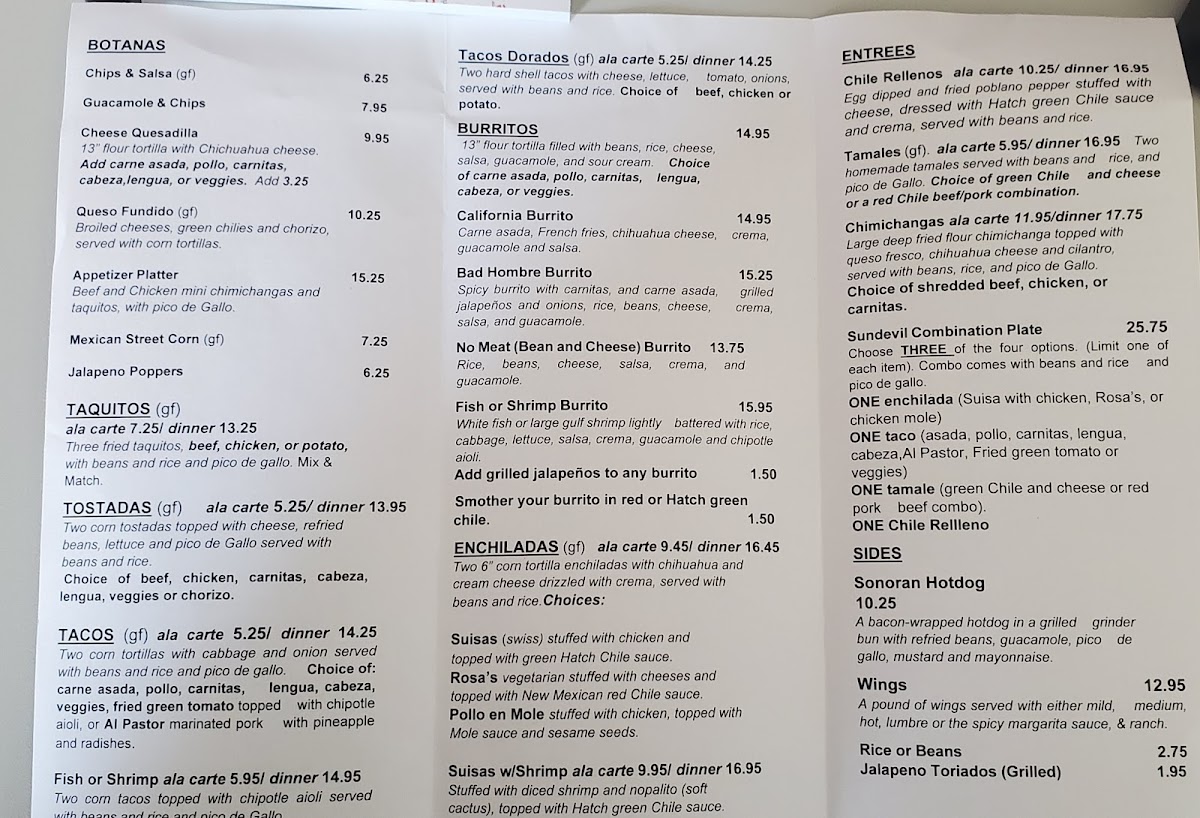 Choice of 3: one enchilada (Suisa, Rosa's or chicken mole), one taco (Carne asada, pollo asado, carnitas, lengua, cabezo, al pastor, fried green tomato, veggies), one tamale, one chile relleno.